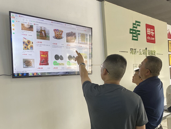 中國郵政集團有限公司梁平區分公司負責人向調研組一行介紹郵樂購平臺上的產品